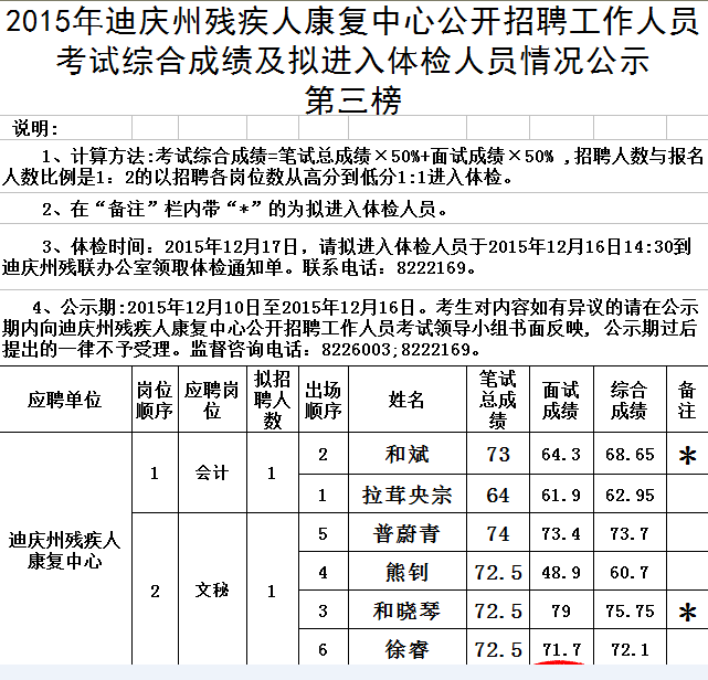 2015年迪慶州殘疾人康復(fù)中心招聘人員綜合成績(jī)及體檢人員公示