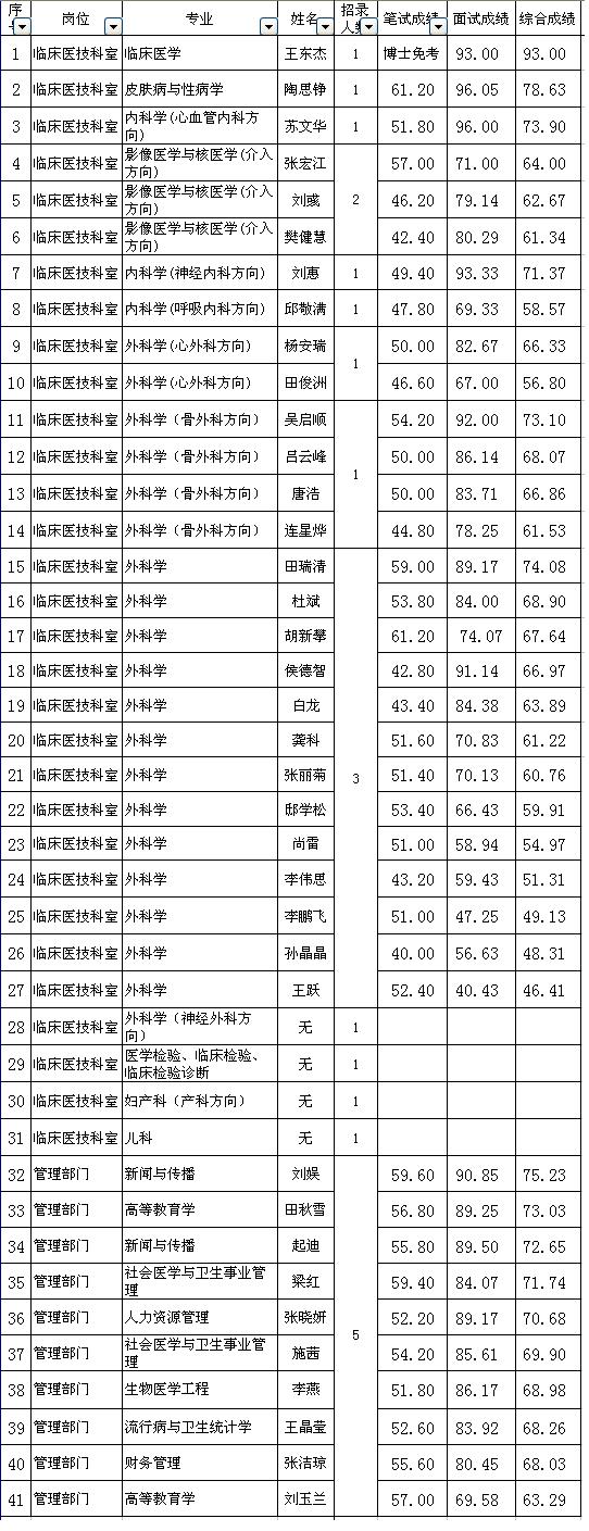 按照上級(jí)要求,現(xiàn)將參加我院2015年公開招聘人員筆試、面試成績(jī)分崗位按分?jǐn)?shù)高低排序進(jìn)行公示。筆試、面試成績(jī)附后。