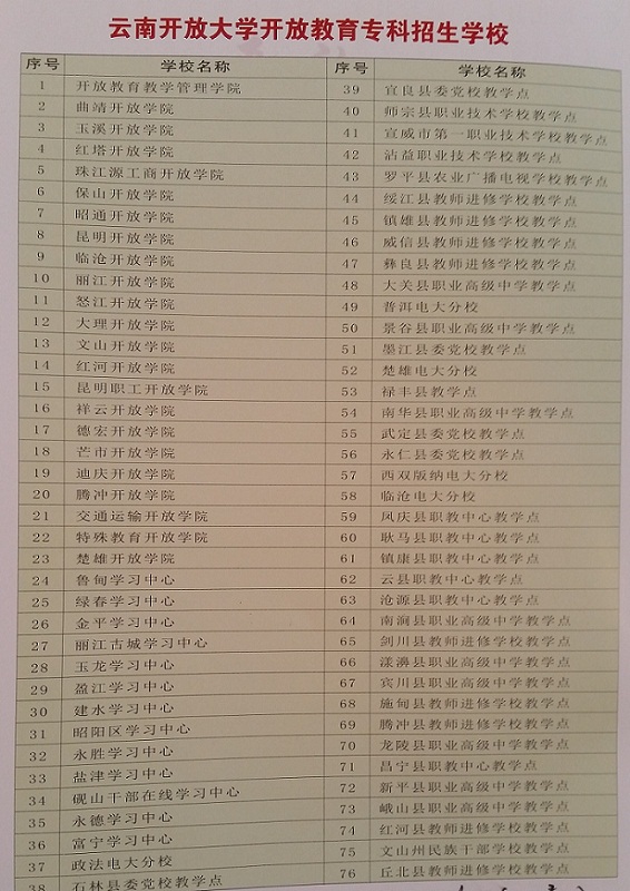 3、招生學(xué)校:經(jīng)批準(zhǔn)開(kāi)展開(kāi)放教育專科招生的云南開(kāi)放大學(xué)相關(guān)開(kāi)放學(xué)院、學(xué)習(xí)中心、分校、教學(xué)點(diǎn),具體招生學(xué)校名單如下: