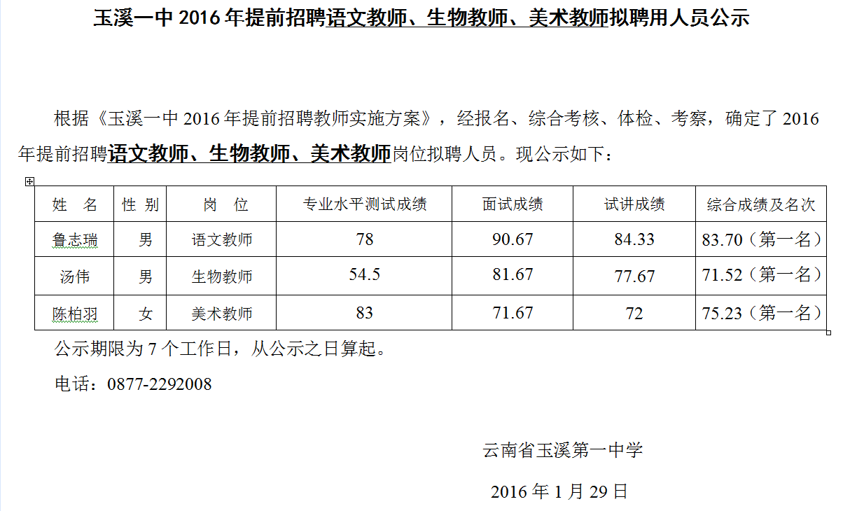 玉溪一中2016年提前招聘語文、生物、美術(shù)教師擬聘公示