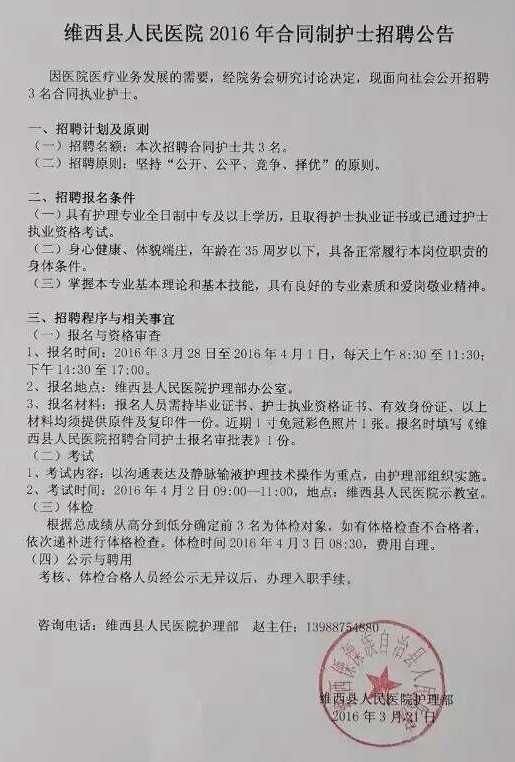 迪慶州維西縣人民醫(yī)院2016年合同制護(hù)士招聘公告
