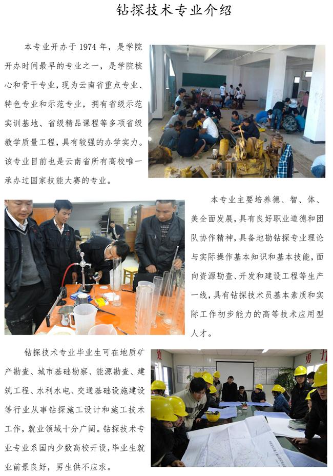 應用工程學院現(xiàn)設置有鉆探技術、基礎工程技術、安全技術管理、環(huán)境監(jiān)測與治理技術、金屬礦開采技術等5個專業(yè),長期致力為云南省區(qū)域經(jīng)濟發(fā)展培養(yǎng)急缺的高等技術應用型人才。在十幾年的發(fā)展過程中,應用工程學院始終遵循“以能力為導向”的高等職業(yè)教育辦學要求,立足產(chǎn)業(yè)行業(yè)發(fā)展,面向生產(chǎn)實際需要,強化校企合作,深化專業(yè)教育教學改革,開設的專業(yè)均構建了以工作過程系統(tǒng)化的課程體系,形成了工學結合的人才培養(yǎng)模式,專業(yè)教育教學改革成果成果豐碩,人才培養(yǎng)質量提到不斷提升。其中,鉆探技術專業(yè)現(xiàn)為云南省重點專業(yè)、特色專業(yè)和省級示范專業(yè),建有校內、校外省級示范實習實訓基地各1個,省級精品課程1門,校級精品課程5門,辦學實力為國內相同專業(yè)最強。依托于該專業(yè),學校多次承辦云南省鉆探技能大賽,2011年11月還成功承辦了第一屆全國地勘鉆探職業(yè)技能大賽,獲得國家相關部委的表彰。2014年,安全技術管理專業(yè)成功申報“云南省高職院校提升專業(yè)服務產(chǎn)業(yè)能力建設項目”,獲得省財政廳和教育廳150萬元的建設資金。同時,依托云南省世行貸款高職院校建設項目,基礎工程技術、環(huán)境監(jiān)測與治理技術和金屬礦開采技術等專業(yè)在專業(yè)建設和實訓條件建設上得到大額資金的支持,專業(yè)辦學實力都將得到較大提升。