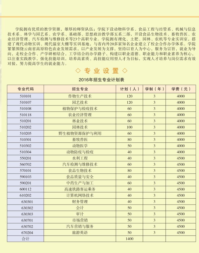 玉溪農(nóng)業(yè)職業(yè)技術(shù)學(xué)院2016年專科招生專業(yè)
