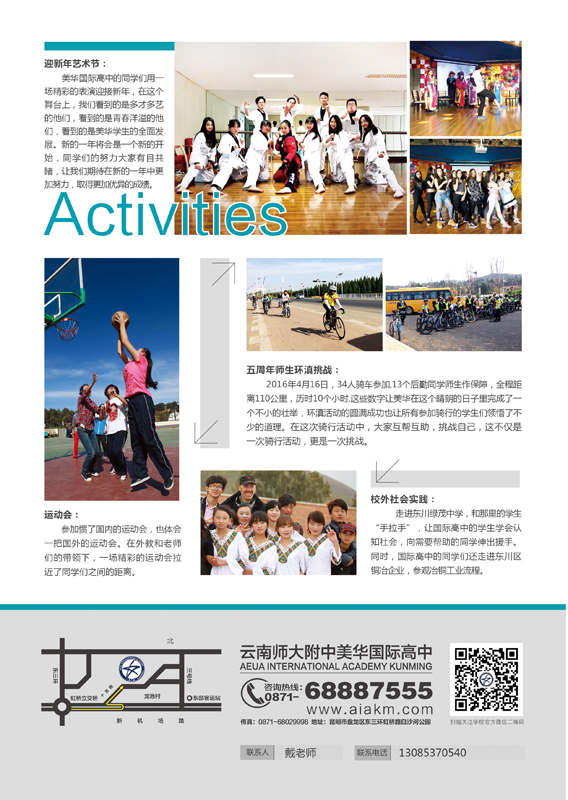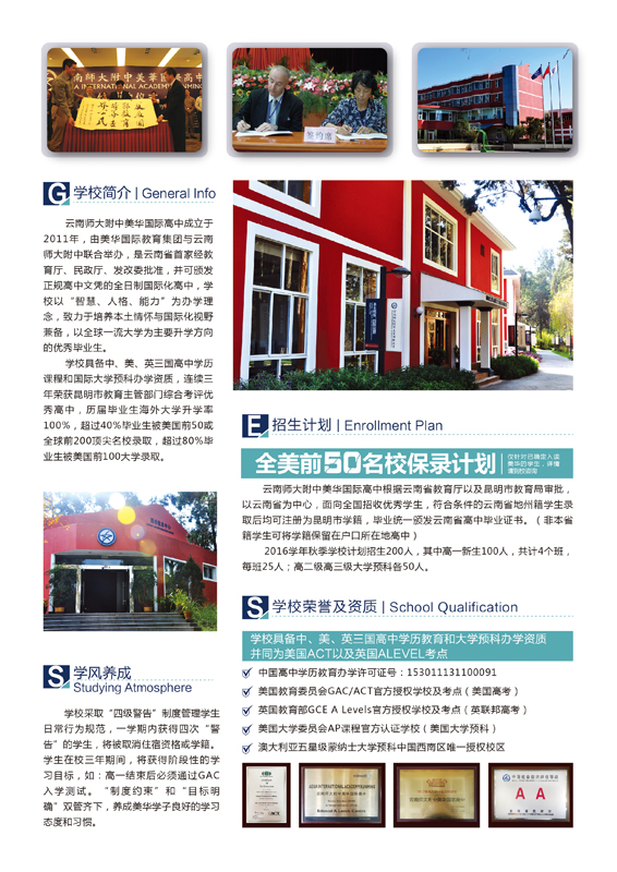 云南師大附中美華國際高中成立于2011年,由云南師大附中與美國教育協(xié)會機構(gòu)聯(lián)合舉辦,是云南省首家經(jīng)教育廳、民政廳、發(fā)改委正式批準的寄宿制國際化高中。學校秉承“智慧、人格、能力”的辦學理念,致力于培養(yǎng)具有本土情懷和國際化視野,并以全球一流大學為主要升學方向的優(yōu)秀畢業(yè)生。辦學5年來,美華國際高中已畢業(yè)100余人,全部畢業(yè)生順利升入海外知名大學就讀,其中90%的畢業(yè)生升學方向為美國,80%的學生被全美前100大學錄取,25%的畢業(yè)生被全美前50或全球前200大學錄取。