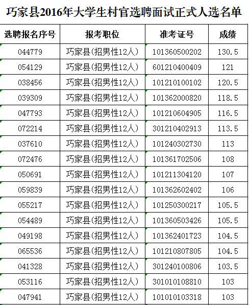 根據(jù)中共昭通市委組織部《關(guān)于做好2016年大學(xué)生村官選聘面試等工作的通知》(昭組電明〔2016〕10號(hào))精神,根據(jù)考生資格復(fù)審情況,分別按照男女職位計(jì)劃選聘人數(shù)與面試人數(shù)1:2比例確定進(jìn)入面試的正式人選,現(xiàn)將面試正式人選予以公示。