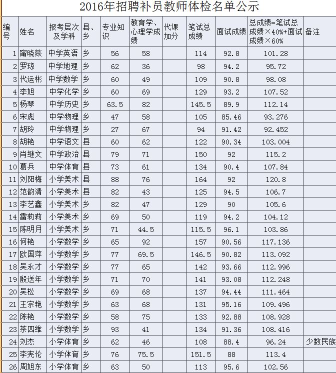 昭通市鹽津縣2016年招聘補(bǔ)員教師體檢名單公示