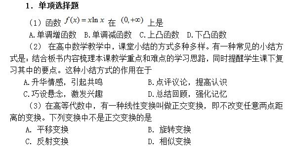 1.?dāng)?shù)學(xué)學(xué)科知識的掌握和運(yùn)用。掌握大學(xué)本科數(shù)學(xué)專業(yè)基礎(chǔ)課程的知識和高中數(shù)學(xué)知識。具有在高中數(shù)學(xué)教學(xué)實(shí)踐中綜合而有效地運(yùn)用這些知識的能力。