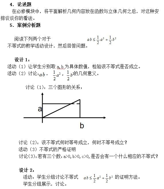 2.高中數(shù)學(xué)課程知識的掌握和運(yùn)用。理解高中數(shù)學(xué)課程的性質(zhì)、基本理念和目標(biāo),熟悉《普通高中數(shù)學(xué)課程標(biāo)準(zhǔn)(實(shí)驗(yàn))》(以下簡稱《課標(biāo)》)規(guī)定的教學(xué)內(nèi)容和要求。