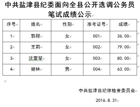 鹽津縣紀(jì)委面向全縣公開(kāi)選調(diào)公務(wù)員筆試成績(jī)公示