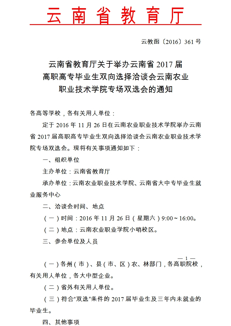云南農(nóng)業(yè)職業(yè)技術學院2017年專場雙選會的通知