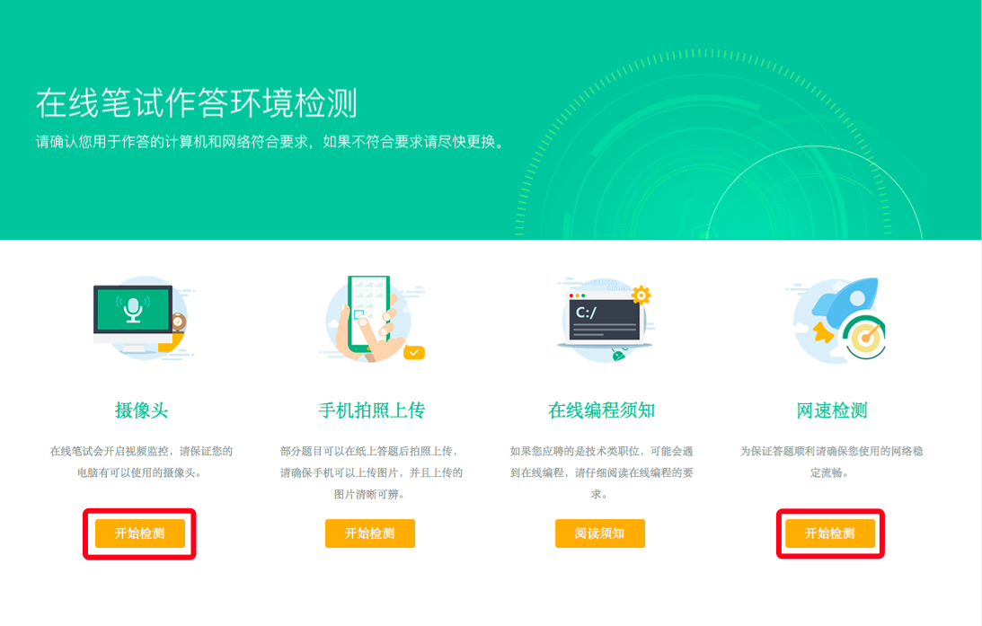 1.本次筆試全程視頻監(jiān)控,請確保您的電腦安裝了Chrome瀏覽器(44以上版本,下載網(wǎng)址https://www.baidu.com/s?wd=chrome)并確保攝像頭可用。為了考試順利,請盡早前往https://assistant.ceping.com進行攝像頭、網(wǎng)速等作答環(huán)境的檢測,不必檢測“手機拍照上傳”和“在線編程須知”(如下圖)。