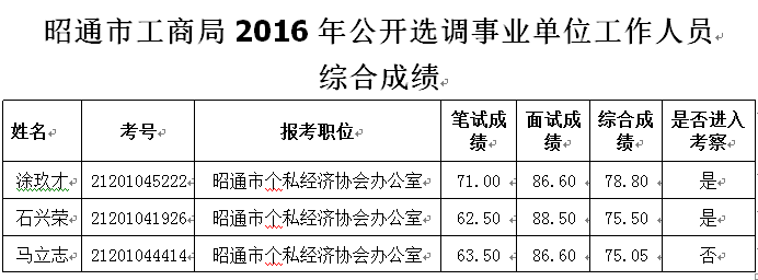 根據(jù)《昭通市人力資源和社會保障局關(guān)于昭通市2016年市直單位公開選調(diào)工作人員的通告》及《昭通市2016年市直單位公開選調(diào)工作人員面試工作有關(guān)事宜的通告》有關(guān)規(guī)定,昭通市工商局在2016年11月17日組織了昭通市個體私營經(jīng)濟協(xié)會辦公室公開選調(diào)事業(yè)人員的面試,現(xiàn)將筆試、面試綜合成績予以公示,公示時間7天。