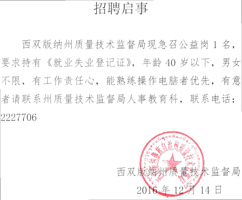 西雙版納州質(zhì)量技術(shù)監(jiān)督局2016年招聘啟事