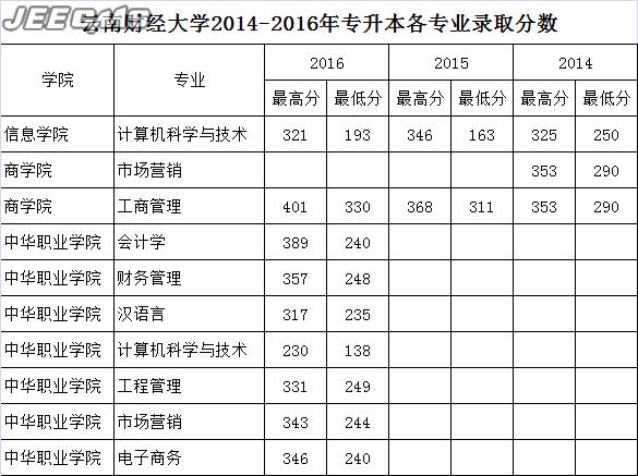 云南財經(jīng)大學2014-2016年專升本各專業(yè)錄取分數(shù)