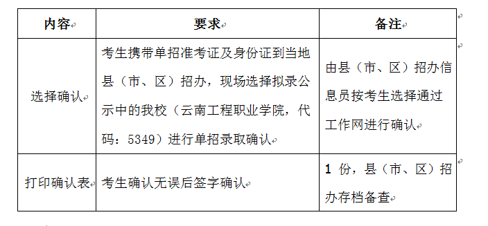 (二)2017年4月5日8時(shí)—4月7日18時(shí)單招擬錄院校專業(yè)確認(rèn)。云南省招考頻道網(wǎng)上公示擬錄名單中的考生,必須到當(dāng)?shù)乜h(市、區(qū))招辦進(jìn)行簽字確認(rèn),被兩所及以上院校擬錄公示的考生,只能選擇一所院校進(jìn)行簽字確認(rèn)。不參加簽字確認(rèn)的考生視為自動(dòng)放棄單招錄取。