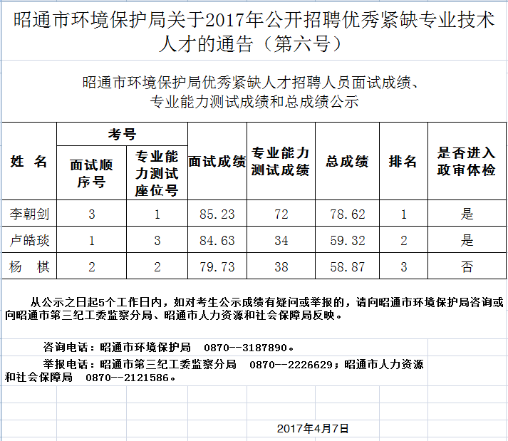 2017年昭通市環(huán)境保護局緊缺招聘總成績公示