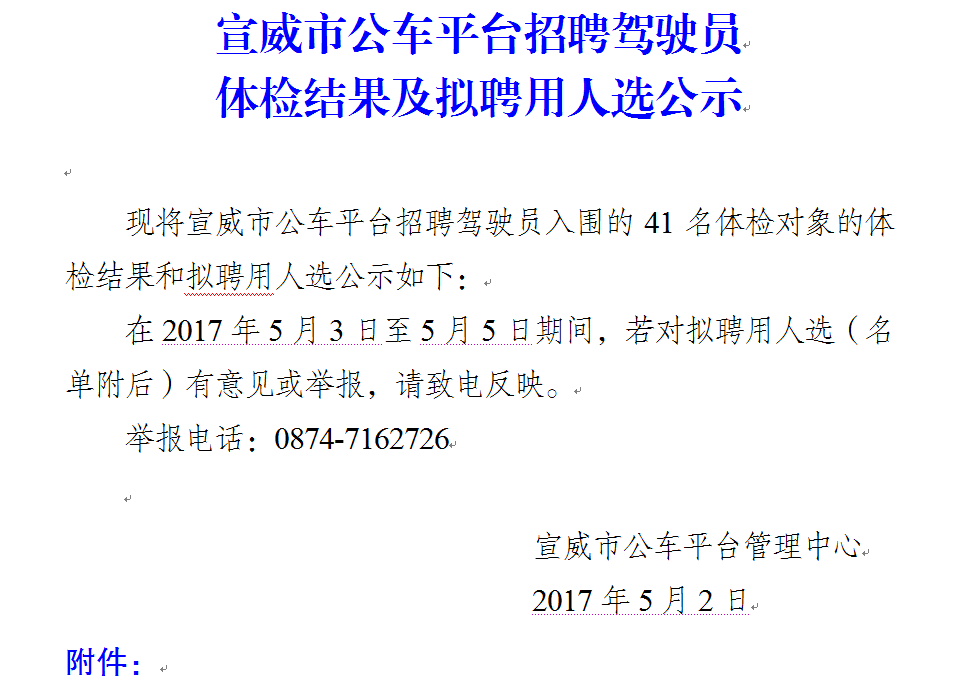 曲靖宣威市公車(chē)平臺(tái)招聘駕駛員體檢結(jié)果及擬聘用人選公示