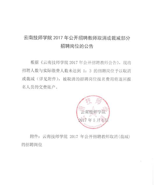云南技師學(xué)院2017年招聘教師取消或裁減部分招聘崗位公告