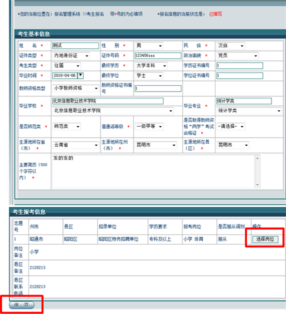 第四步:按順序、提示填寫(xiě)“考生基本信息”、“考生隱私信息”和考生報(bào)考信 息,在這些信息填寫(xiě)完成后,務(wù)必點(diǎn)選“保存”按鈕。其中在選擇崗位時(shí)請(qǐng)點(diǎn) 選“選擇崗位”按鈕進(jìn)入頁(yè)面選擇需要報(bào)考的崗位。