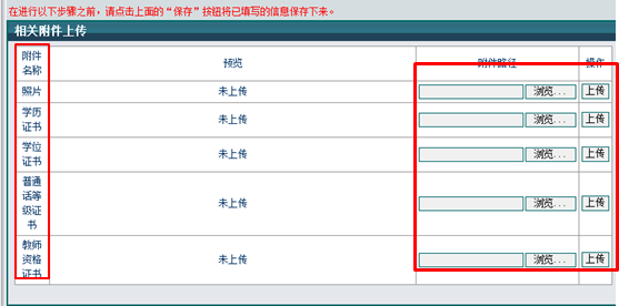 4.考生上傳相關(guān)照片附件。其中,考生證件照(像素比為:171*142以內(nèi);文件大小為:20K以內(nèi))、身份證照片(或掃描件)、普通話證照片(或掃描件)所有考生必須上傳;“學(xué)歷證書(shū)”及“教師資格證”往屆生必須上傳照片或掃描件,如果填寫(xiě)“學(xué)位證書(shū)編號(hào)”則“學(xué)位證書(shū)”必須上傳。其它文件大小請(qǐng)保證每個(gè)在1M以內(nèi),并且圖像清晰。