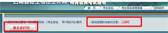 第七步:提交完成后,請(qǐng)考生時(shí)刻關(guān)注“報(bào)名信息查看”頁(yè)面中頂端的狀態(tài)提 示和審核意見(jiàn)信息:當(dāng)前審核狀態(tài),待狀態(tài)變更為“已初審”,在線報(bào)名才全部 完成,然后考生可以打印報(bào)名表。