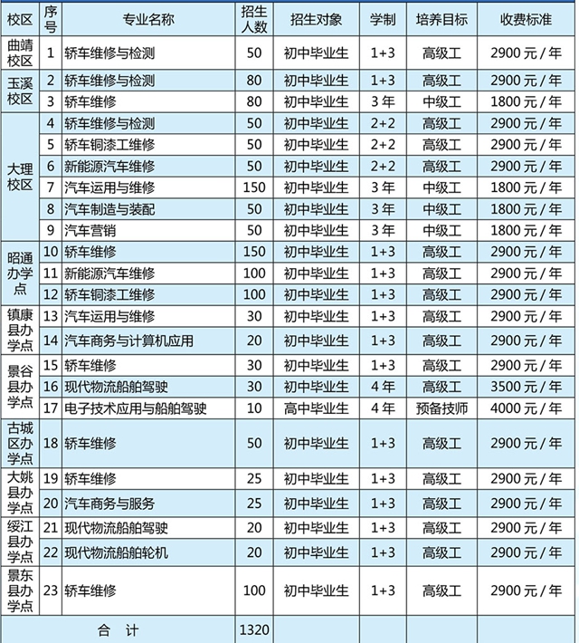 云南交通技師學(xué)院2017招生計(jì)劃表(分校)