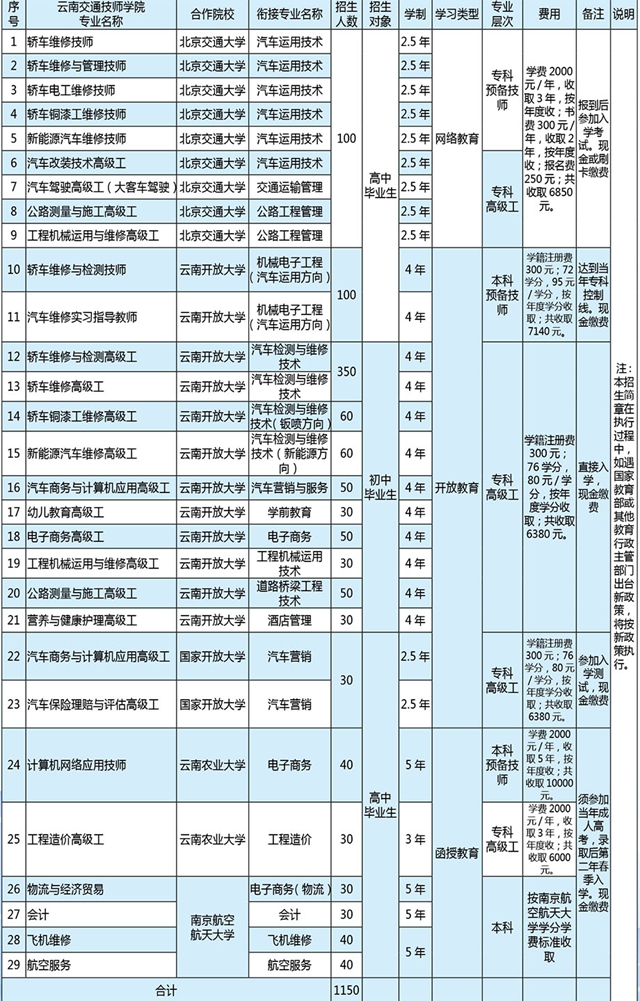 云南交通技師學(xué)院2017年繼續(xù)教育專、本科招生計(jì)劃表
