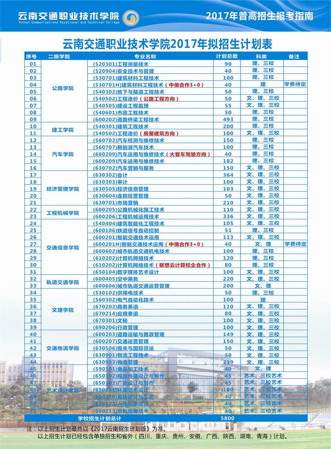 云南交通職業(yè)技術(shù)學(xué)院2017年擬招生計(jì)劃表