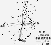 圖11為某網(wǎng)上商城通過大數(shù)據(jù)分析繪制的“城市牽掛”示意圖。由于遷出人口比例較高,甲地網(wǎng)購收貨量中,從異地下訂單的寄達(dá)商品所占比例最高,從而成為2014年全國最受異地牽掛的城市。讀圖11回答第22小題。