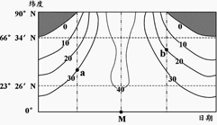 圖13表示一年中大氣上界單位面積水平面上每日接收到的太陽輻射隨緯度的變化(單位為MJ/m2 ),圖中陰影部分表示沒有太陽輻射。回答第25~26小題。