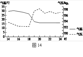 2013年7月30日,我國西北某地出現(xiàn)強沙塵暴。圖14為該地當(dāng)日14時~24時氣溫、氣壓隨時間變化的示意圖。讀圖回答第27~28小題。