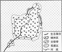 綠洲與荒漠的交錯帶生態(tài)環(huán)境脆弱,在其附近的綠洲區(qū)過量開采地下水會使交錯帶生態(tài)環(huán)境退化,形成“生態(tài)裂谷”。圖15為“生態(tài)裂谷”分布示意圖。讀圖回答第29~30小題。