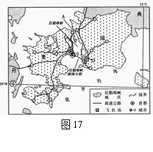位于瑞典和丹麥兩國交界處的厄加勒斯海峽地區(qū)擁有多所著名大學(xué),當(dāng)?shù)卣ㄟ^多種方式支持產(chǎn)學(xué)研合作項目,促進了生命科學(xué)、生物技術(shù)、醫(yī)療技術(shù)和醫(yī)藥技術(shù)等產(chǎn)業(yè)的集聚發(fā)展。目前,該地區(qū)已成為歐洲著名的“醫(yī)藥谷”。2000年,厄加勒斯海峽跨海大橋建成通車。圖17為厄加勒斯海峽地區(qū)及周邊區(qū)域圖。