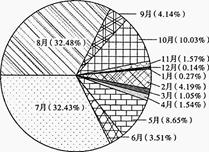 以自然旅游資源為主的四川某景區(qū)平均海拔4800多米,景區(qū)游客數(shù)量季節(jié)差異明顯。圖18為該景區(qū)各月游客數(shù)量比重餅狀圖。