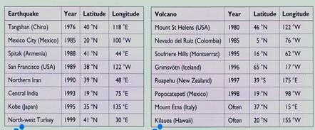1. 閱讀近幾年發(fā)生的主要火山、地震的表格,根據(jù)表中提供的經(jīng)緯度,在地圖上找到它們的準(zhǔn)確位置。在一張世界空白圖上把它們標(biāo)注出來。