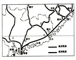 福建省委、省政府提出“建設(shè)海峽西岸經(jīng)濟(jì)區(qū)”這一戰(zhàn)略構(gòu)想,中心目標(biāo)就是發(fā)展福建經(jīng)濟(jì),在一個(gè)更大的范圍內(nèi)進(jìn)行生產(chǎn)結(jié)構(gòu)和資源配置,為全面實(shí)現(xiàn)兩岸“三通”,建設(shè)臺(tái)灣海峽經(jīng)濟(jì)圈奠定基礎(chǔ)。圖11是廈深鐵路示意圖,讀圖回答第28~29小題。