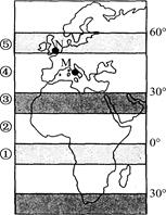 (2) 圖中所示北半球處于 季,此季節(jié)氣壓帶、風(fēng)帶位置偏 。半年后,M地將受 (填數(shù)字)帶控制,氣候特征是 。