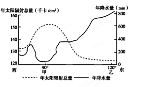圖2為沿第二亞歐大陸橋中國(guó)段的年降水量和年太陽(yáng)輻射總量分布圖,讀圖回答第4~5小題。