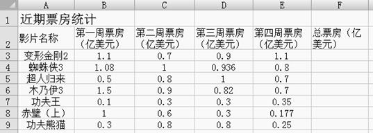 31.下圖是用Excel制作的某市近一個月電影票房收入統(tǒng)計情況表,請寫出利用求和公式和自動填充功能計算出每一部電影的總票房收入的步驟。