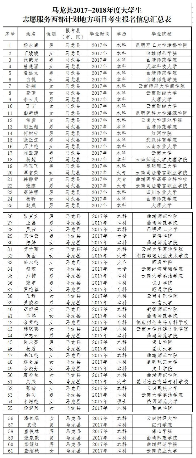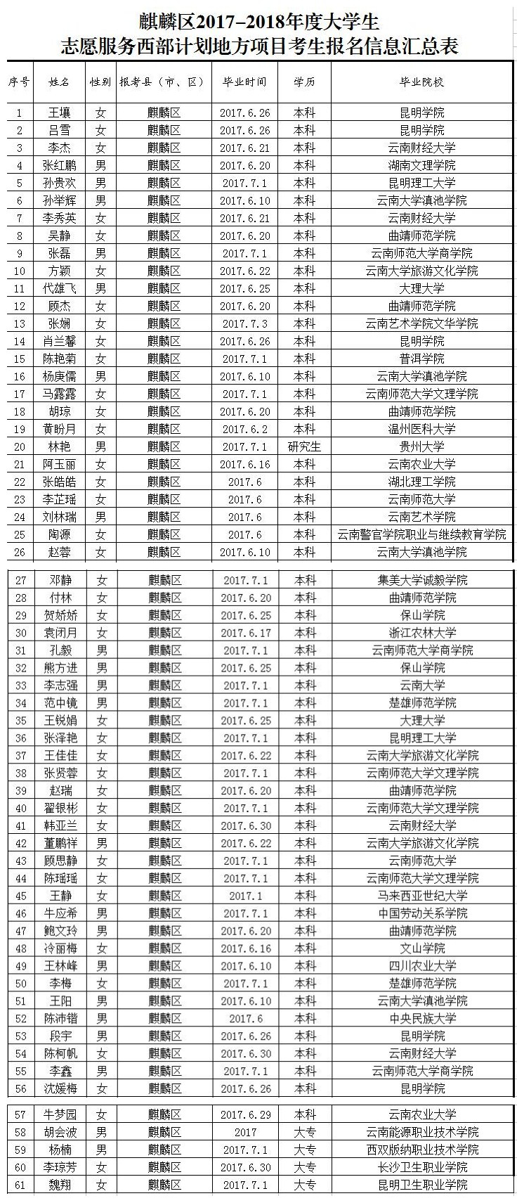 附件:曲靖市2017-2018年度大學(xué)生西部計(jì)劃地方項(xiàng)目考生筆試詳細(xì)名單