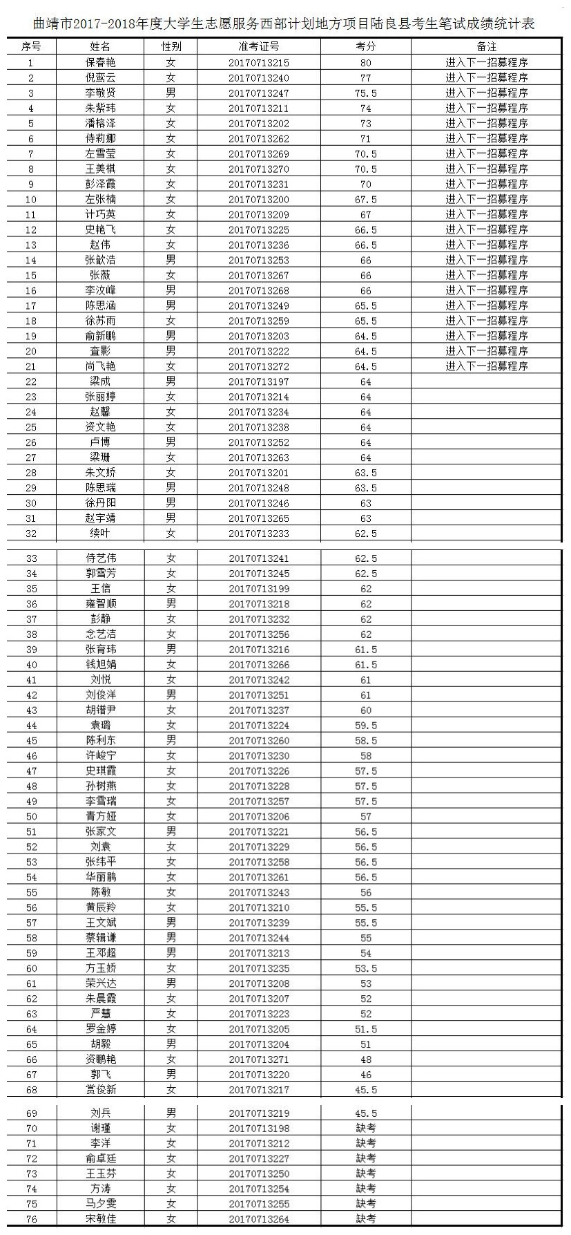 根據(jù)曲靖市2017-2018年度大學(xué)生志愿服務(wù)西部計劃省級地方項目志愿者招募程序, 此次招考共801人報名參加,其中應(yīng)考678人,缺考123人。曲靖市2017—2018年度大學(xué)生志愿服務(wù)西部計劃省級地方項目招募名額為100名,其中:麒麟?yún)^(qū)10人,宣威市8人,沾益區(qū)11人,馬龍縣11人,陸良縣10人,師宗縣10人,富源縣11人,羅平縣7人,會澤縣12人,經(jīng)開區(qū)10人。本次筆試成績根據(jù)招募崗位(以縣〈市〉為單位)1︰2的比例,按照筆試成績從高到低確定進(jìn)入下一招募程序名單。現(xiàn)將志愿者招募筆試成績公告如下。