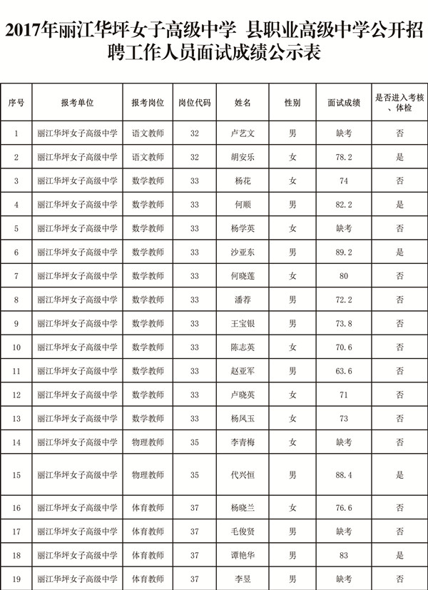 2017年7月17日麗江華坪女子高級(jí)中學(xué)縣職業(yè)高級(jí)中學(xué)公開(kāi)招聘工作人員面試工作已經(jīng)結(jié)束,現(xiàn)將此次公開(kāi)招聘面試成績(jī)公示(公示期為七天:2017年7月18日至7月24日)如下: