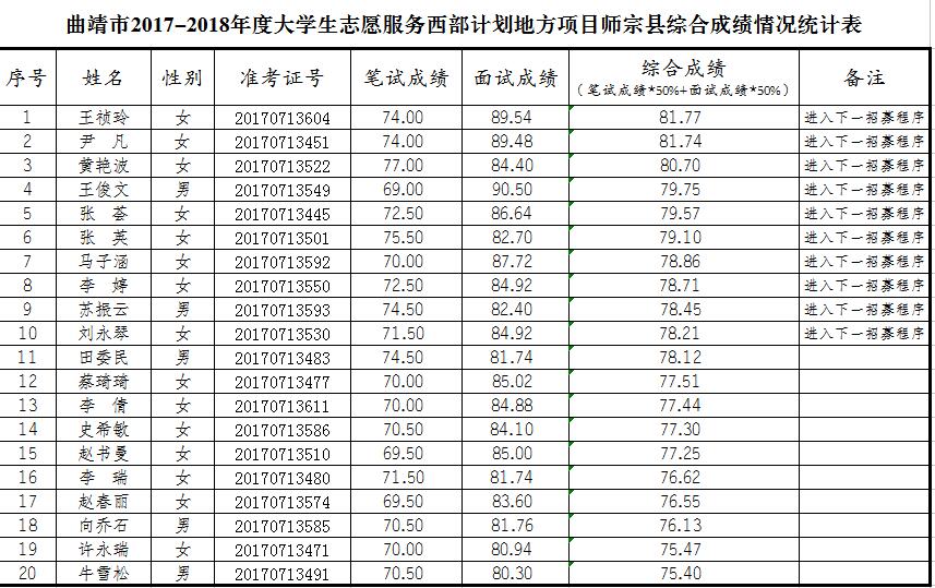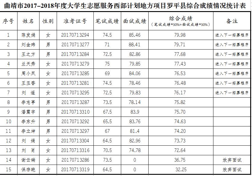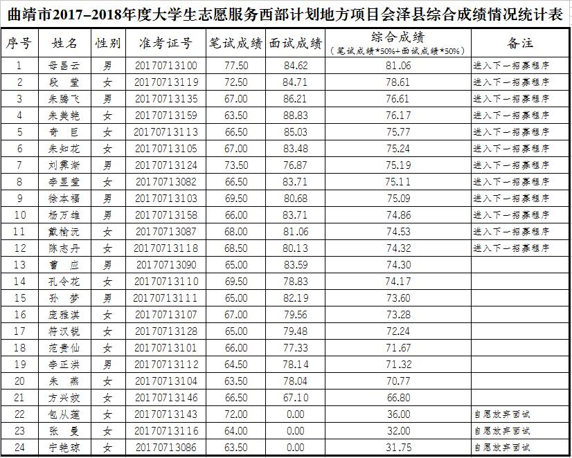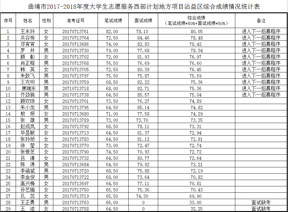 根據(jù)曲靖市2017-2018年度大學(xué)生志愿服務(wù)西部計(jì)劃省級(jí)地方項(xiàng)目志愿者招募程序,現(xiàn)將志愿者招募綜合成績(jī)公告如下。
