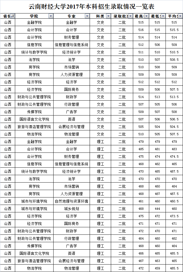 云南財(cái)經(jīng)大學(xué)2017年山西省錄取情況一覽表