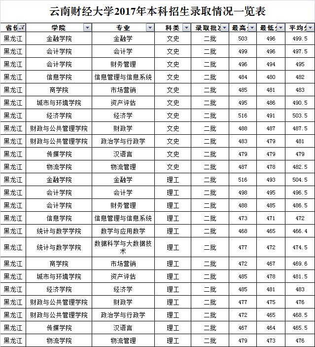云南財經(jīng)大學(xué)2017年黑龍江省錄取情況一覽表