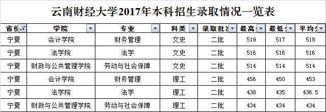 云南財經大學2017年寧夏回族自治區(qū)錄取情況一覽表