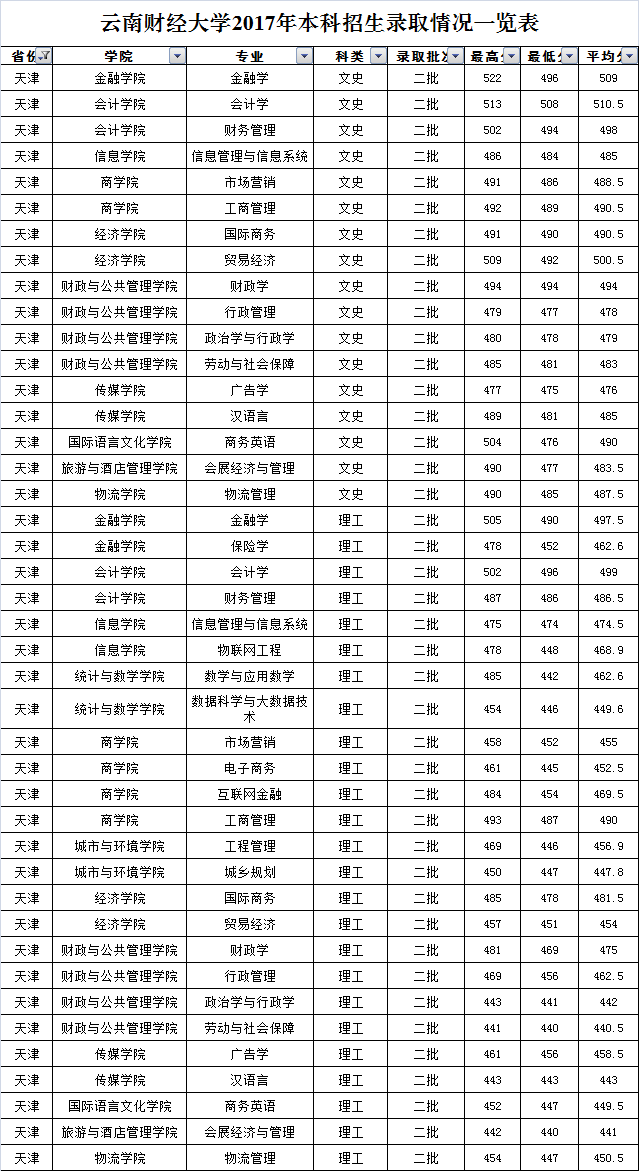云南財經(jīng)大學(xué)2017年天津市錄取情況一覽表