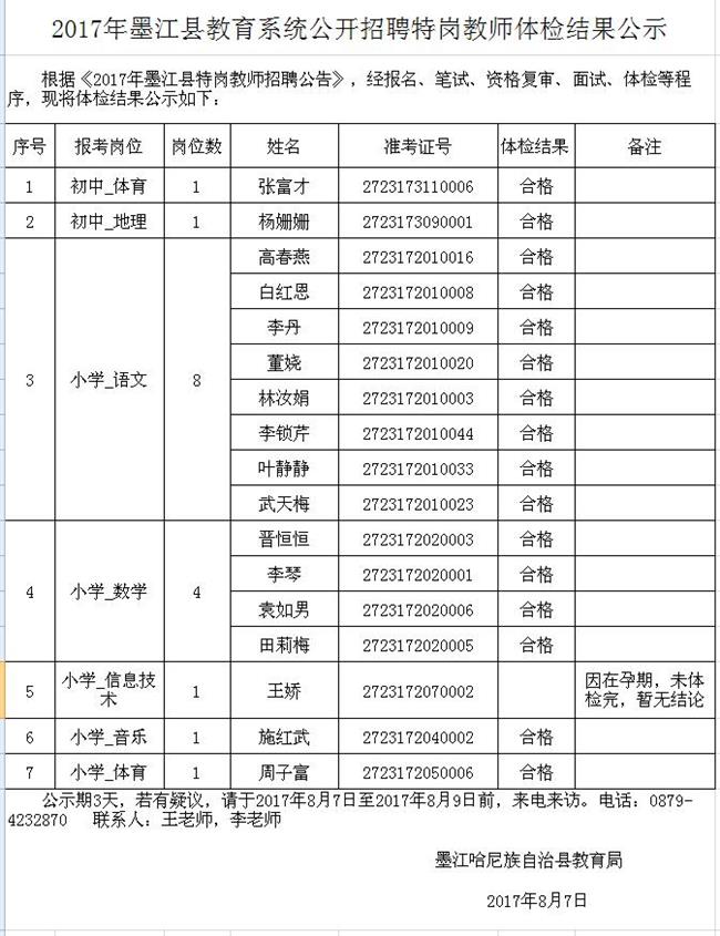 2017年墨江縣公開招聘特崗教師體檢結(jié)果公示