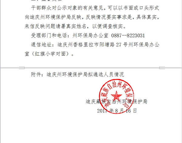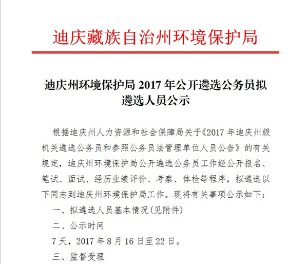 迪慶州環(huán)境保護(hù)局2017年公開遴選公務(wù)員擬遴選人員公示