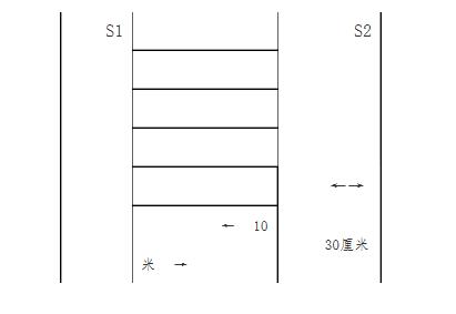 場地器材:10米長的直線跑道若干,在跑道的兩端線(S1和S2)外30厘米處各劃一條線(圖1)。木塊(5厘米×10厘米)每道3塊,其中2塊放在S2線外的橫線上,一塊放在S1線外的橫線上。秒表若干塊,使用前應(yīng)進(jìn)行校正。
